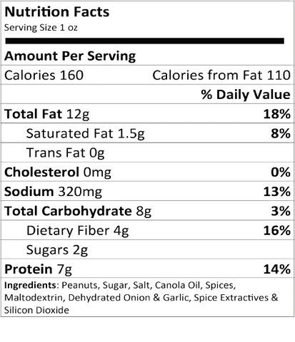 Ingredients: Peanuts, Canola Oil, Sugar, Salt, Spices, Maltodextrin, Dehydrated Onion & Garlic, Spice Extractives & Silicon Dioxide.