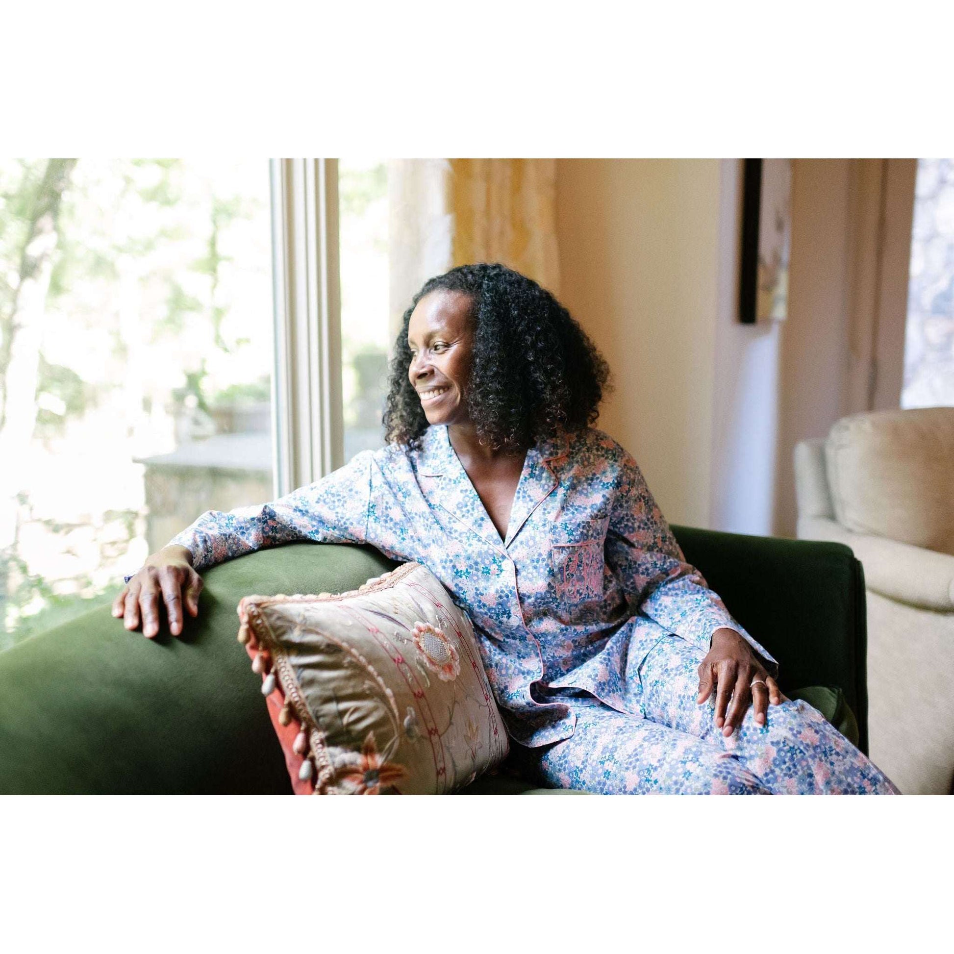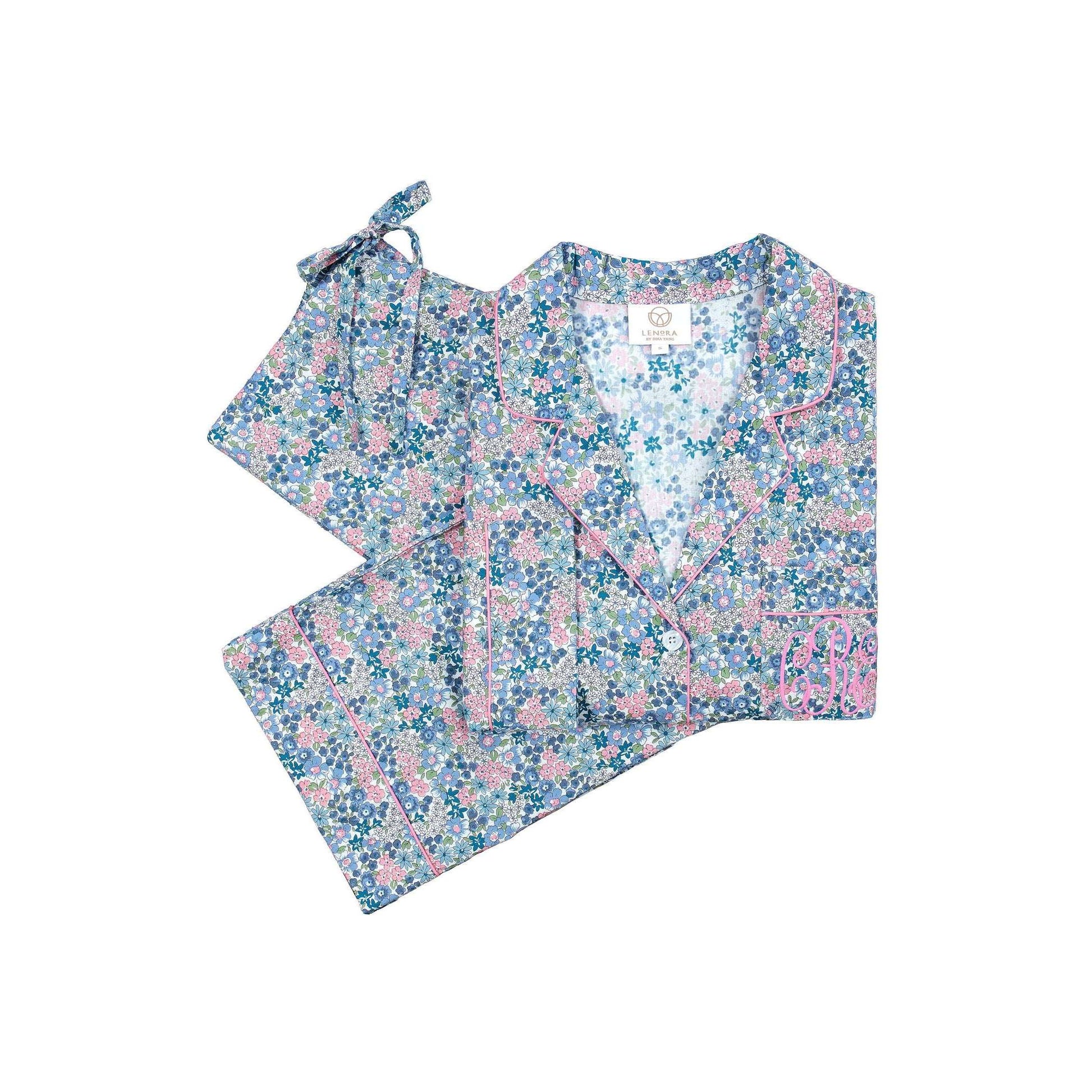 Get prepared for the best sleep ever in these CLASSIC PAJAMAS - BLUEBERRY FLORAL. The button-front shirt has a notched collar, the pants have a drawstring elastic waist, and are made with our 100% Poplin Cotton blueberry floral, piped in a coordinating pink trim, making this the perfect PJ for any occasion.