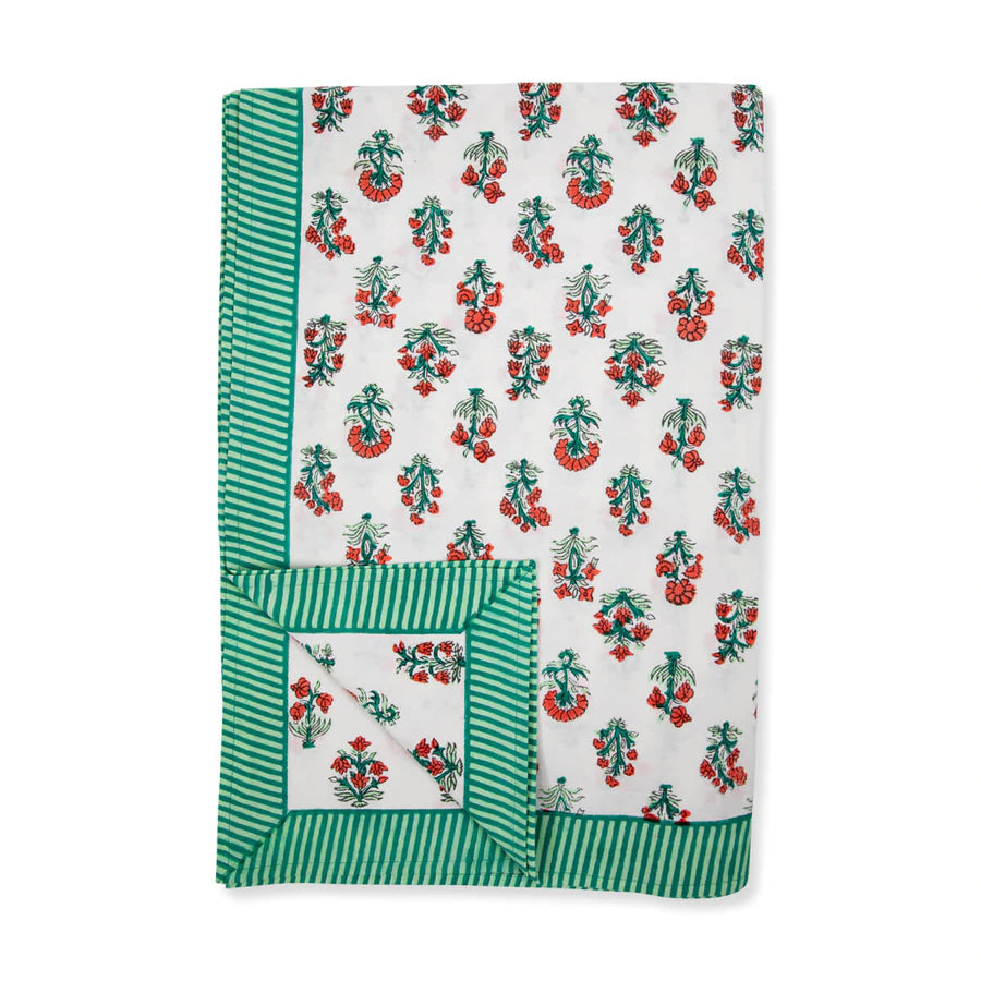 Make your meals extra festive with this exclusive block print tablecloth and napkins. We love the charming color combo and the chic striped trim.