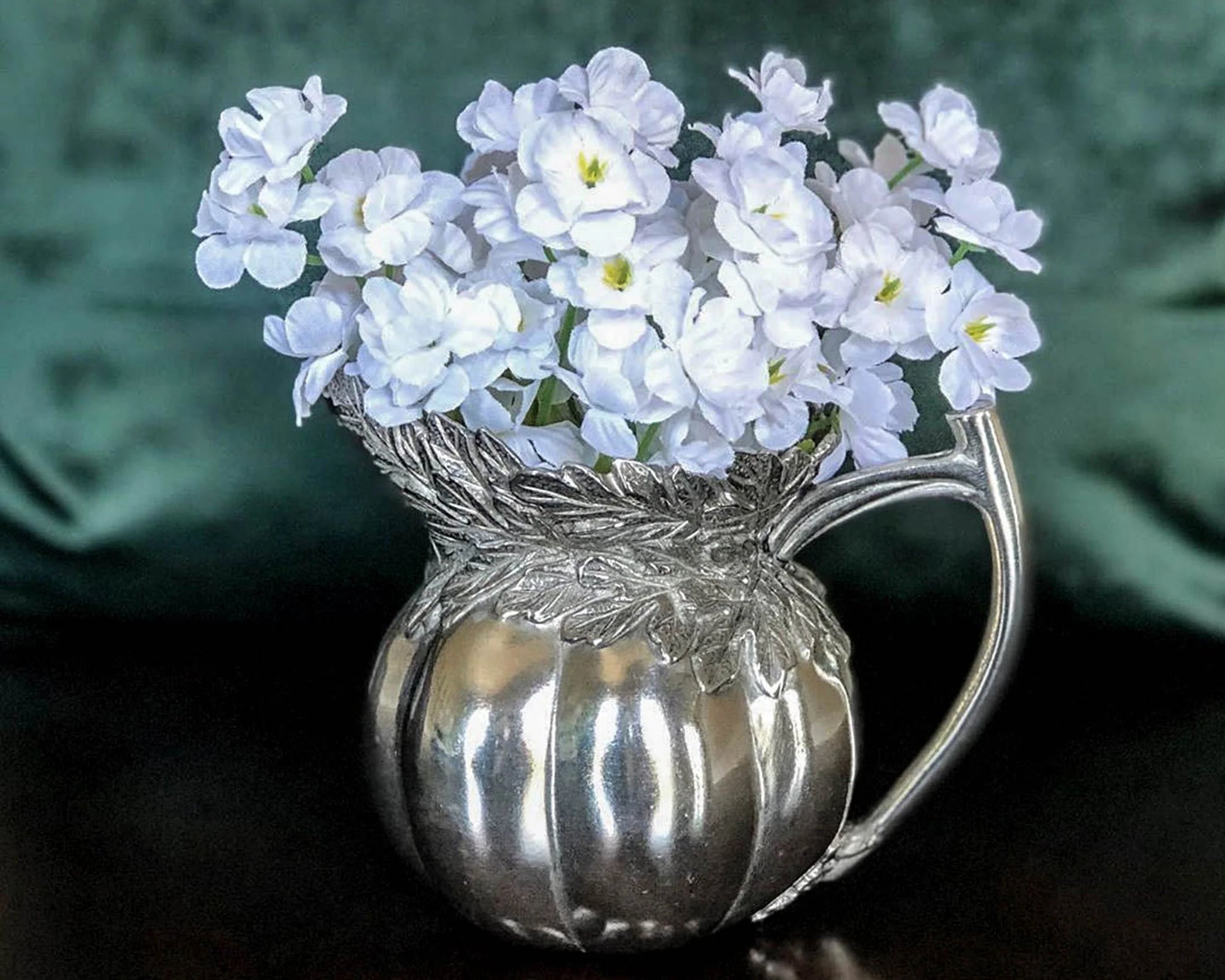 Crafted in the shape of a tomato, our pure-pewter pitcher features an intricate wreath of leaves around its neck and mouth, while a handle emerges from the back of this decorative design. The detailed foliage gives the container a jagged rim, which contrasts beautifully with the smooth texture of the fruit.