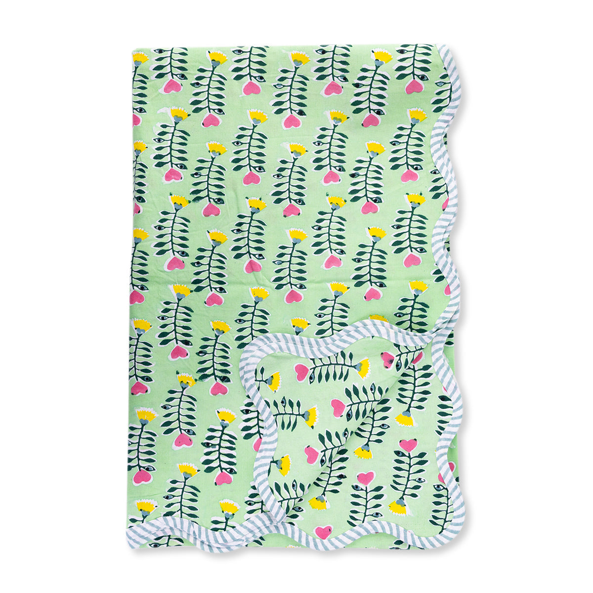 Make your meals extra festive with this exclusive block print tablecloth and napkins. We love the charming color combo and the chic striped trim.