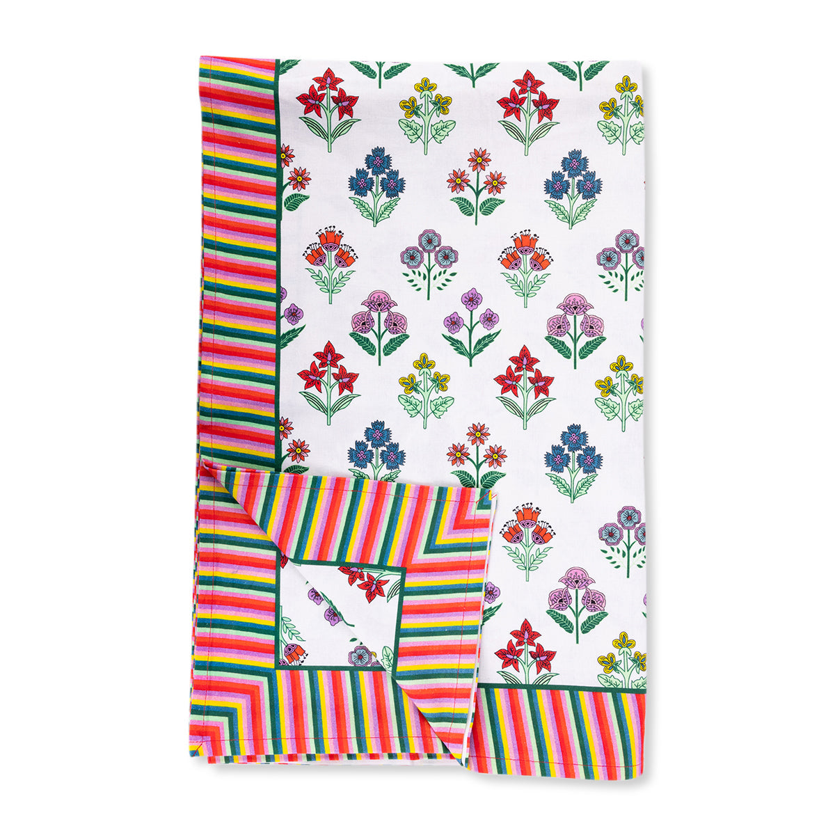 Make your meals extra festive with this exclusive block print tablecloth and napkins. We love the charming color combo and the chic striped trim.