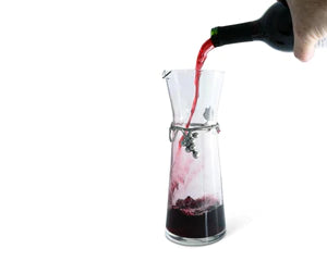 Complement your favorite wine with the sophisticated design of this Vineyard Carafe from Vagabond House. A beautiful vine wraps around the neck of this piece as additional flourishes branch off its line to support bundles of grapes and leaves. Crafted in pure, luxury pewter, the design acts as a necklace of sorts for this elegant carafe. The cylindrical glass opens into a wider mouth, which features a V-shaped rim on one side for easy pouring.